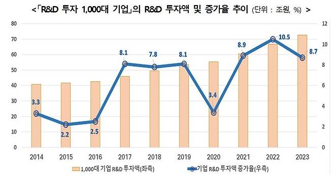 1000대 기업, 매출 감소에도 R&D 70조 돌파…전년比 8%↑