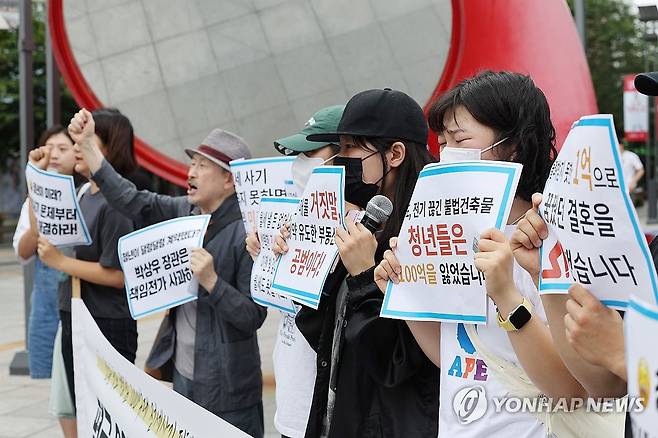 (서울=연합뉴스) 임화영 기자 = 23일 오전 서울 마포구 신촌 대학가 일대에서 열린 '신촌·구로·병점 100억대 전세 사기 피해자 대책위원회 출범 기자회견'에서 전세사기 피해자들이 전세사기특별법 개정 및 정부의 문제 해결을 촉구하고 있다.