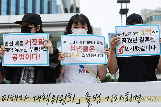 (서울=연합뉴스) 임화영 기자 = 23일 오전 서울 마포구 신촌 대학가 일대에서 열린 '신촌·구로·병점 100억대 전세 사기 피해자 대책위원회 출범 기자회견'서 전세사기 피해자들이 전세사기특별법 개정 및 정부의 문제 해결을 촉구하고 있다.