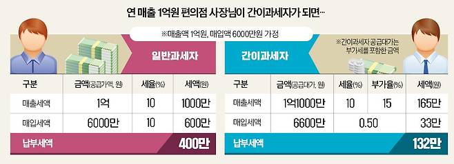 간이과세는 일반과세보다 세제상 혜택이 많다. 우선 부가가치세율이 낮아진다. 일반과세자는 부가세율이 10%지만 간이과세는 1.5~4% 수준이다. 예를 들어 연 매출액이 1억원이고 연 매입액이 6000만원인 편의점 사장님의 경우 기존에는 매출세액 1000만원에서 매입세액 600만원을 뺀 400만원을 세금으로 내야 했다. 다음달부터 간이과세가 적용되면 매출세액과 공제세액이 각각 165만원과 33만원으로 줄어 납부 세액이 132만원으로 감소한다. 직전 연도 매출이 4800만원 미만인 간이과세자는 부가세 납부를 면제받는다.
