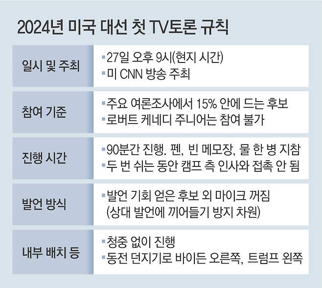 통상 미 대선 TV토론은 양당 전당대회 이후인 9, 10월경에 열렸다. 이번에는 첫 토론을 6월로 앞당겨 누가 기세를 잡느냐에 따라 향후 선거 과정에도 파장이 이어질 것으로 보인다. 로이터 통신은 22일 각각 82세와 78세인 바이든, 트럼프 두 후보의 나이를 거론하며 “고령 후보들의 인지 능력에 대한 중요한 시험대가 될 것”이라고 전망했다.
