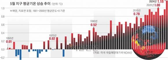 22일(현지시간) 뉴욕타임스(NYT)에 따르면 미국 국립해양대기국(NOAA)은 올해 5월 지구 대륙과 해양 표면의 기온 상승률은 1.18도로 현대 기상관측 이후 175년 만에 가장 따뜻한 5월이었다고 밝혔다. NOAA는 지난해가 역사상 가장 뜨거운 해였다고 발표했는데 올해 다시 해당 기록을 갈아치울 가능성이 61%에 달한다고 전망했다.