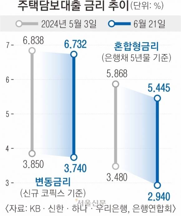 23일 금융권에 따르면 지난 21일 기준 KB국민·신한·하나·우리은행의 주택담보대출 혼합형 금리는 연 2.940~5.445%로 집계됐다. 지난달 3일(연 3.480~5.868%)과 비교하면 금리 상단은 0.423% 포인트, 하단은 무려 0.540% 포인트 낮아졌다.