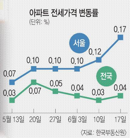 한국부동산원이 최근 발표한 6월 셋째 주(17일 기준) 전국 아파트 가격 동향에 따르면 이번 주 전국 전세가격은 0.04% 상승했다. 지난해 7월 24일부터 48주 동안, 한 차례를 제외하고 매주 상승했다. 올해 누적 전세가격 변동률은 서울 2%, 경기 1.54%, 인천 2.89%로 전국 평균 0.67%를 상회했다.