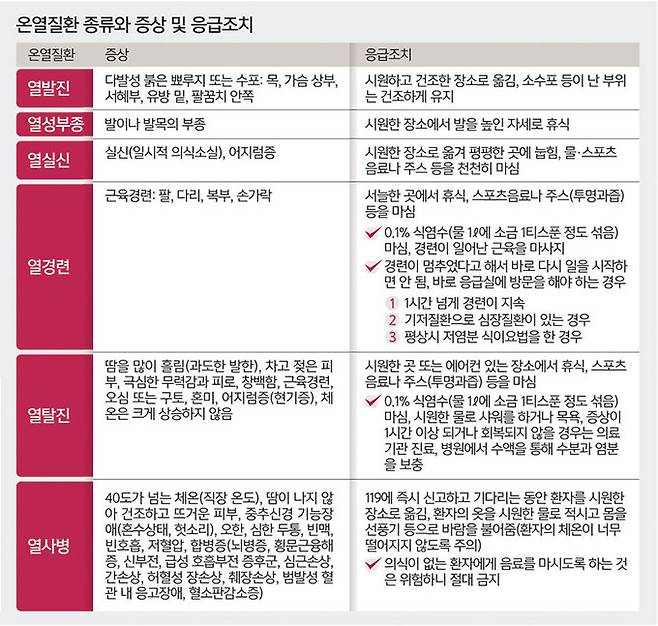 “열사병은 더위로 인해 심부체온이 상승한 상태를 묘사하는 의학 용어다. 체온이 40도를 넘게 되면 중추신경계에 영향을 주게 돼 체온 조절 기능이 약화하고 순환기, 호흡기, 신경계, 소화기계 등 다양한 장기에 영향을 준다. 일반인이 병원에 갈 만한 상태인지를 판단하는 것은 어렵다. 이를 구분하려다가 자칫 환자를 살릴 수 있는 골든타임을 놓치게 하는 요인이 된다. 언행이 불분명해지거나 숨이 가빠지고 심장이 빨리 뛰고, 두통이나 메슥거림 등의 증상이 나타나면 119에 신고하는 것이 좋다.”