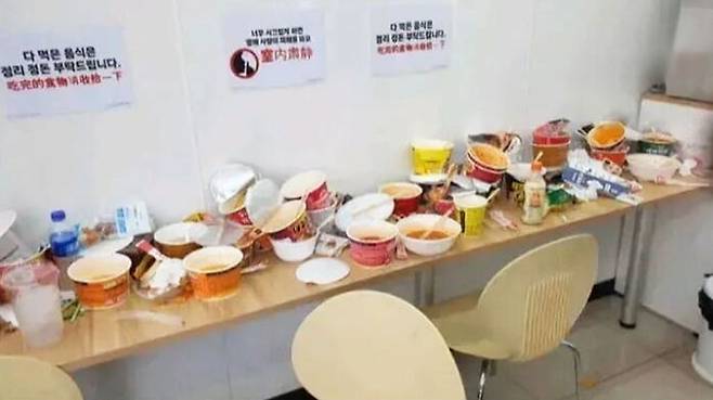 편의점 벽에 '다 먹은 음식은 정리정돈 부탁드립니다'라는 안내 문구가 중국어로도 적혀 있었는데 이런 안내문이 무색한 모습입니다.