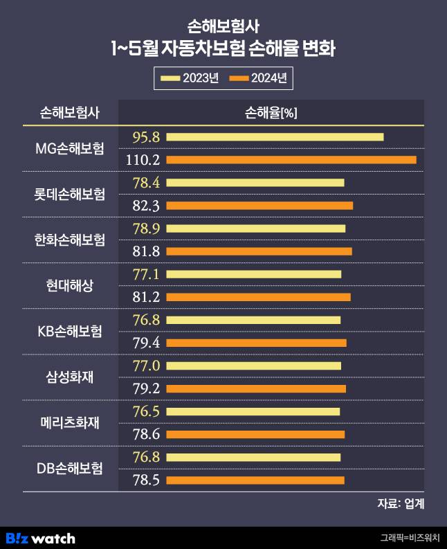 이외 MG손해보험(110.2%)의 손해율이 가장 높게 나타났고, 한화손해보험(81.8%), 롯데손해보험(82.3%) 등도 80%를 뛰어넘었다.