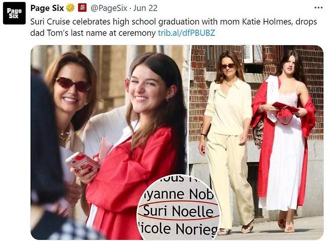 할리우드 스타 톰 크루즈(61)의 딸 수리(18)가 성년이 된 뒤 맞은 고등학교 졸업식에서 '크루즈'라는 성을 빼고 이름을 썼다고 미 연예매체 페이지 식스가 23일(현지시간) 전했습니다.