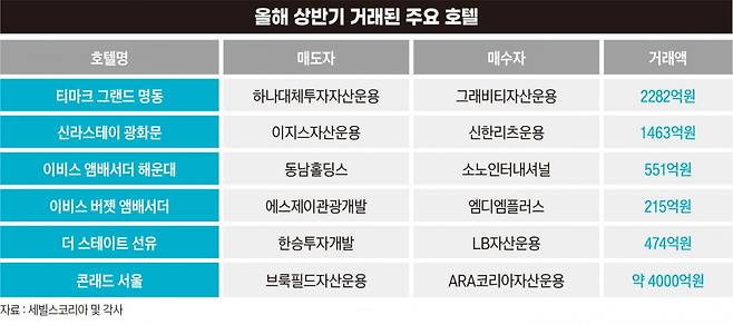 최근 국내 호텔 거래가 그 어느 때보다 활발하게 이뤄지고 있다. 매물이 등장했다 하면 바로 거래가 이뤄진다는 말이 나올 만큼 호텔에 눈독을 들이는 투자자가 많다. 수치로도 나타난다. 글로벌 종합 부동산 서비스기업인 세빌스코리아에 따르면 올해 상반기 한국 호텔 거래 규모는 총 9185억원으로 집계됐다. 아직 한 해가 절반밖에 지나지 않았는데 벌써 작년 연간 호텔 거래 규모(1조2232억원)의 75%에 해당하는 규모의 딜이 성사됐다.