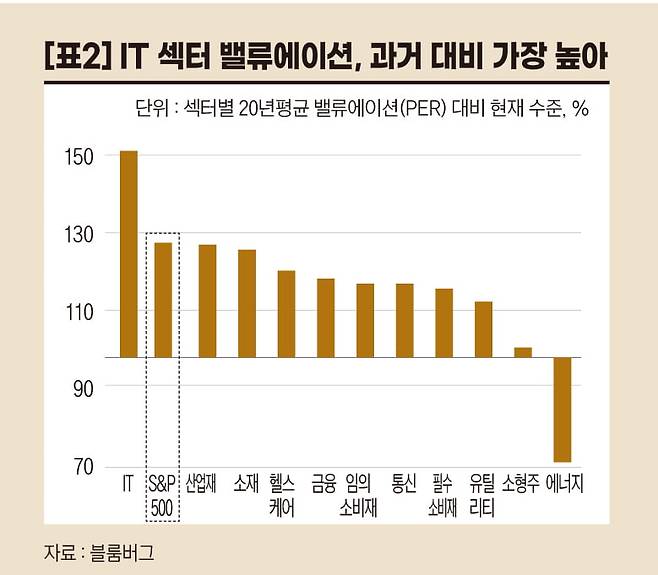 섹터 중에서는 IT가 과거 평균 대비 152%로 S&P500 수준을 크게 넘었다. S&P500에서 32%를 차지하는 IT가 미국 주식시장의 밸류에이션 상향 및 수익률 상승을 이끌어왔음을 알 수 있다.