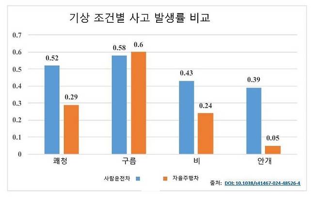 비가 내릴 때도 자율주행차의 사고 발생 확률은 사람 운전 차의 3분의 1 수준이었다. 자율주행차의 레이더는 안개나 비와 같은 악천후 상황에서 150m 이상 떨어진 물체를 감지할 수 있는 반면, 사람은 10m 거리의 물체까지만 인식할 수 있기 때문인 것으로 연구진은 추정했다.