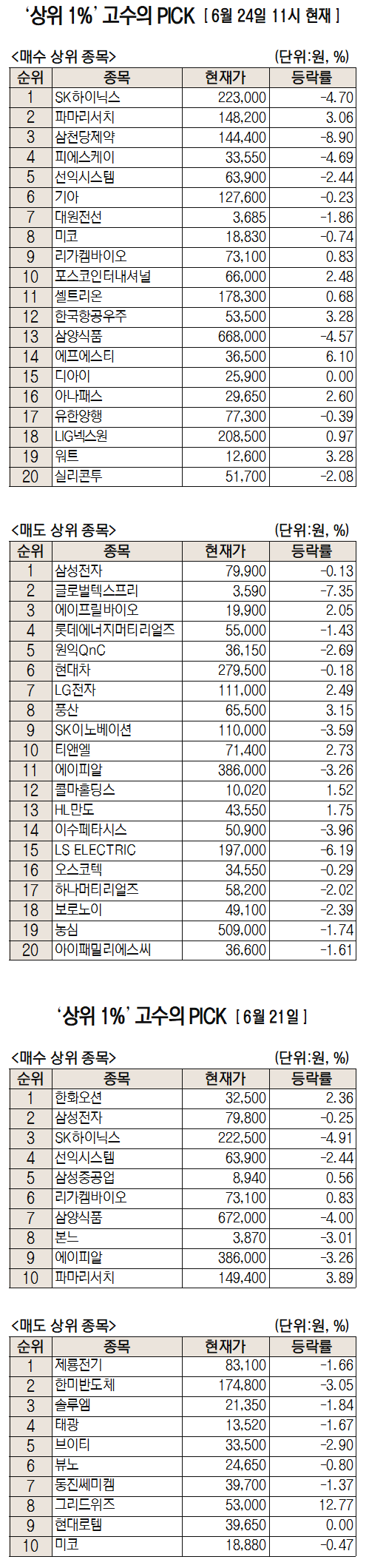 미래에셋증권에서 거래하는 고수익 투자자들이 24일 오전 가장 많이 순매수한 종목은 SK하이닉스(000660)로 나타났다. 이밖에 파마리서치(214450), 삼천당제약(000250) 등이 순매수 상위권에 올랐다.