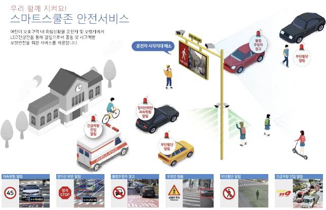 ‘스마트 스쿨존 시스템’은 어린이보호구역 차량과 등굣길 불법주정차 등으로 인해 발생할 수 있는 교통사고를 해결하기 위해 도입된 안전 시스템이다. 스쿨존의 AI CCTV를 통해 차종, 각종 위반차량, 무단횡단자, 보행 약자, 긴급차량 등 다양한 정보를 전광판에 실시간 표출해 사각지대 교통사고를 예방한다.