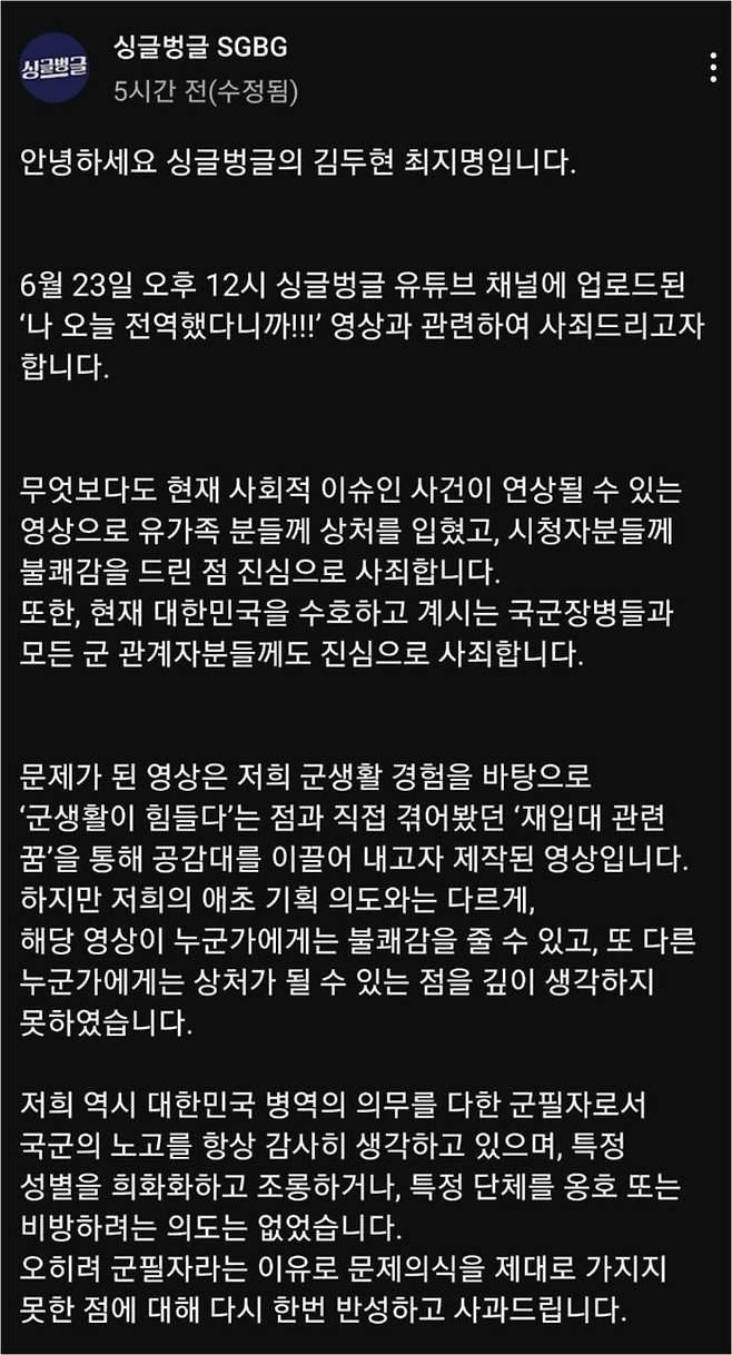 오늘(24일) 유튜브 코미디 채널 '싱글벙글'은 전날 업로드한 '나 오늘 전역했다니까!!!'라는 제목의 영상을 삭제하고 사과문을 올렸습니다.