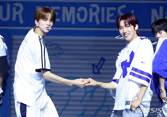 [서울=뉴시스] 김혜진 기자 = 그룹 투어스(TWS) 신유, 영재가 24일 오후 서울 용산구 블루스퀘어에서 열린 두 번째 미니앨범 '서머 비트!(SUMMER BEAT!)' 발매 기념 쇼케이스에서 무대를 선보이고 있다.