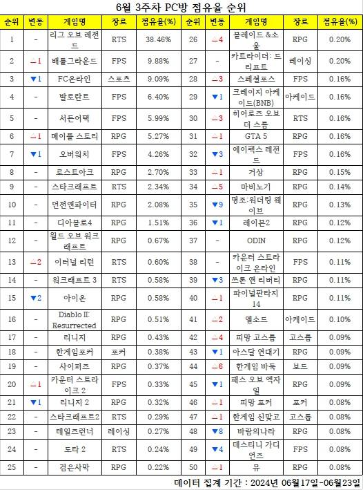 한 주간의 PC방 순위를 되짚어 보고, 어떤 변화가 있었는지 알아보는 'PC방순위' 코너입니다. 데일리게임은 매주 PC방 순위를 일목요연하게 정리, 독자들이 알아보기 쉽도록 제공합니다. 지난 한 주간 어떤 PC 온라인게임들이 눈길을 끌었는지 살펴봤습니다. < 편집자주 >