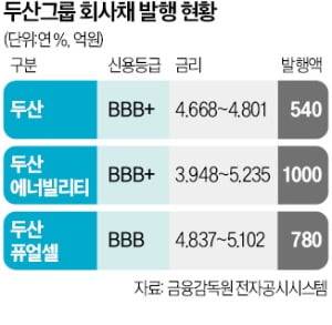 두산뿐 아니라 두산에너빌리티(신용등급 BBB+), 두산퓨얼셀(BBB) 등도 각 회사 민평금리(채권 평가사들이 평가한 기업의 고유 금리)보다 훨씬 낮은 금리에 회사채를 발행하는 데 성공했다.