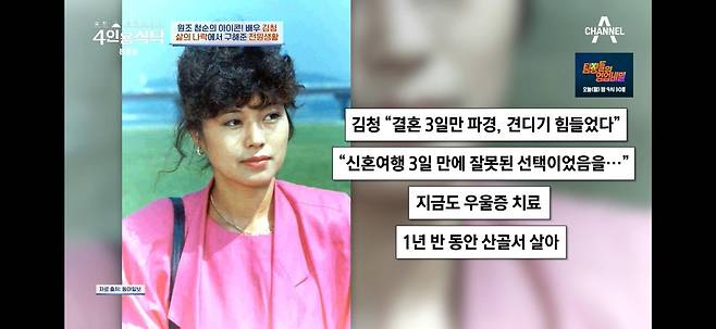 그런가 하면 김청은 1998년 결혼 3일 만에 초고속 이혼으로 화제를 낳은 바 있는데 이때 일을 언급했다. 김청은 이혼 후 세간의 이목을 피하고자 강원도 산속 암자에서 1년 반 동안 머물렀다고.