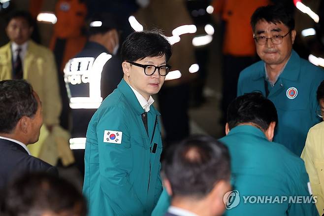(화성=연합뉴스) 홍기원 기자 = 국민의힘 한동훈 전 비상대책위원장이 24일 오후 경기도 화성시 서신면 소재 리튬전지 공장 화재 현장을 방문하고 있다. 2024.6.24