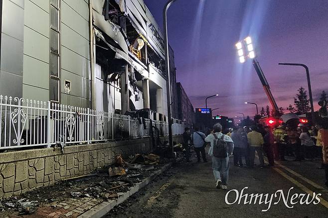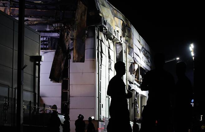 | ▲ 24일 오후 경기 화성시 일차전지 공장 화재 현장에서 소방대원들이 현장 수습 작업을 하고 있다. |