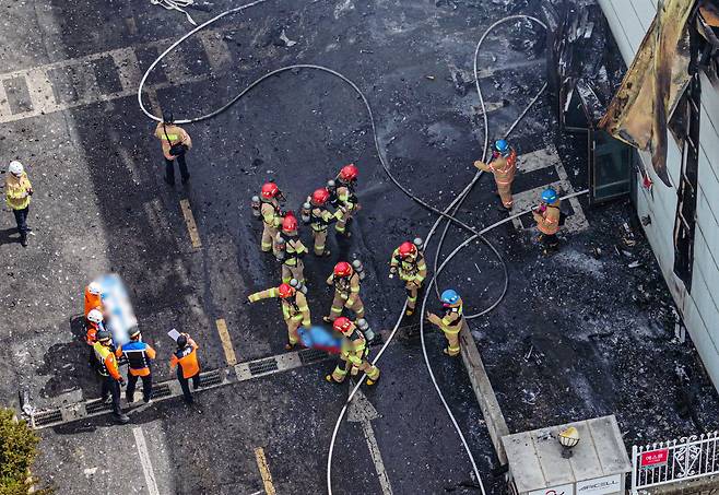 | ▲ 24일 경기도 화성시 서신면 소재 일차전지 제조업체 공장 화재 현장에서 소방관들이 시신을 수습하고 있다. |