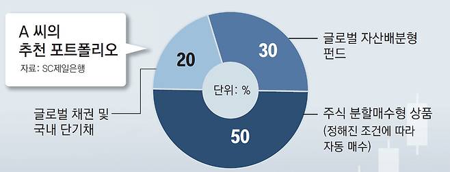 한편 분할 매수형 펀드는 목돈을 투자할 때 A 씨가 갖는 부담을 최소화할 수 있다. 초기 주식 투자 비중을 25∼30%로 시작한 뒤 시장이 상승할 때 비중을 조금씩 늘리고 하락할 때는 좀 더 높은 비중으로 매수에 나서는 방식을 시스템적으로 적용하는 것이다. 이를 통해 변동성을 줄이면서도 정해진 조건에 따라 자동으로 분할 매수할 수 있다.