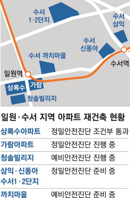 1990년대 초반 지어져 재건축 연한(30년)을 막 넘긴 서울 강남구 수서·일원동 노후 단지들이 재건축 작업에 시동을 걸고 있다. 안전진단 절차를 밟는 단지들이 속속 나타나는 가운데 첫 번째로 정밀안전진단을 통과한 아파트도 나왔다.