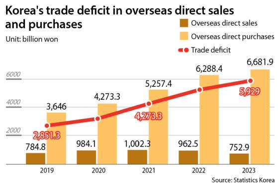 Korea's trade deficit in the online shopping market, excluding duty-free shops, was 5.9 trillion won last year, almost doubling from 2.85 trillion won in 2019, according to online shopping trend data from Statistics Korea on Thursday.