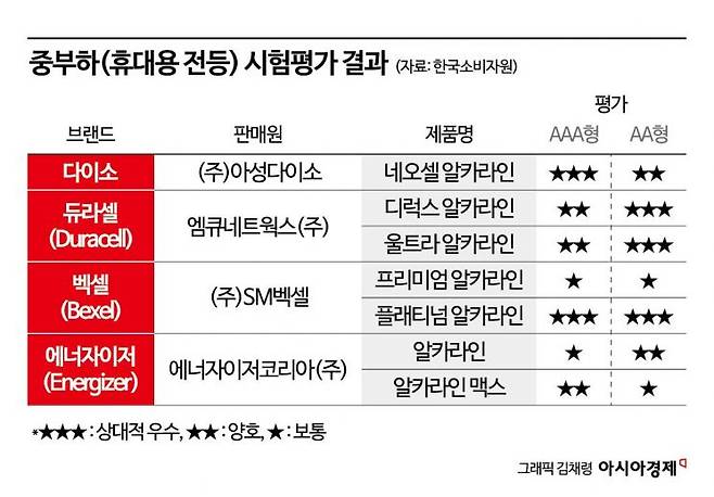 중부하(작동완구·휴대용 전등) 작동 조건에선 AAA형은 다이소(네오셀), 벡셀(플래티넘) 등 2개 제품, AA형은 듀라셀(디럭스·울트라), 벡셀(플래티넘) 등 3개 제품 지속시간이 상대적으로 우수했다.