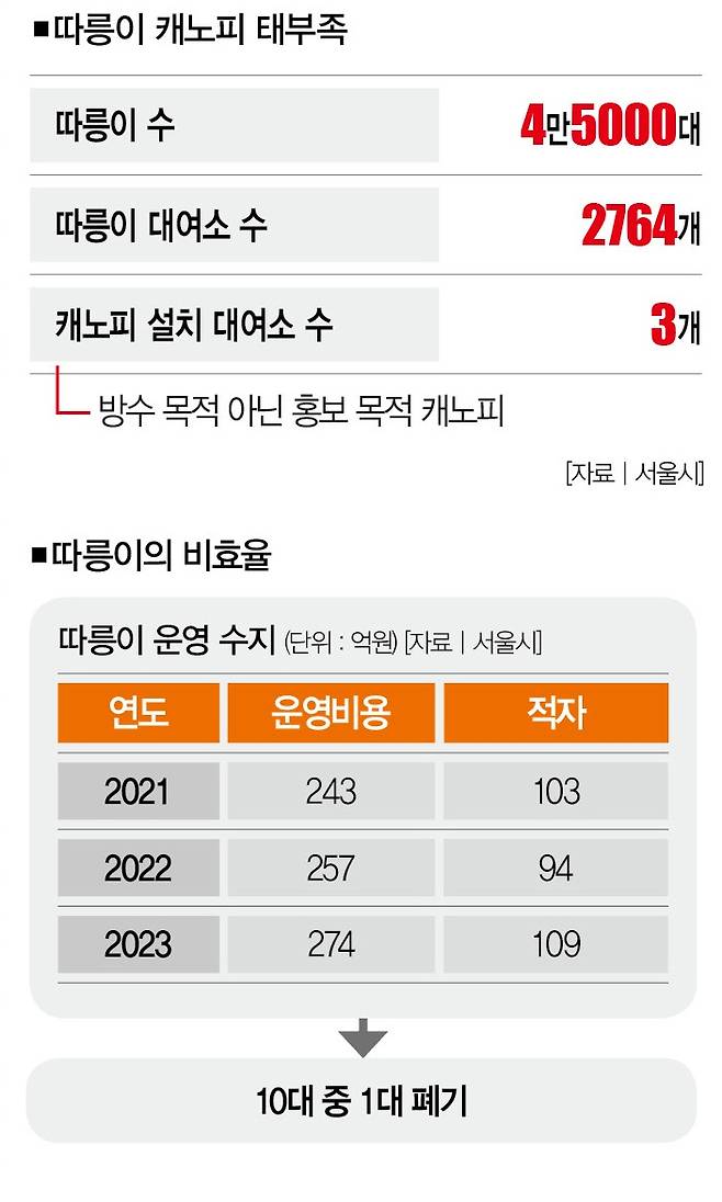 소홀한 관리 탓인지 폐기하는 따릉이는 갈수록 증가하고 있다. 2021년 2230대였던 따릉이 폐기 건수는 2023년 4500대로 93.1% 증가했다. 서울시가 보유하고 있는 따릉이 4만5000대 중 10%를 폐기하고 있는 셈이다. 따릉이가 운영비용 증가(2021년 243억원→2023년 274억원)로 100억원 넘는 적자를 기록하고 있다는 점을 감안하면 '비효율의 극치'다.