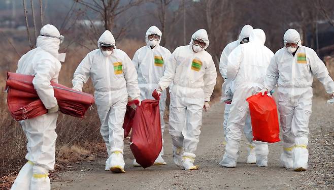 | ▲ 가축방역관들이 조류인플루엔자(AI) 감염이 의심되는 닭을 수거하고 있다. 2016.12.26 |