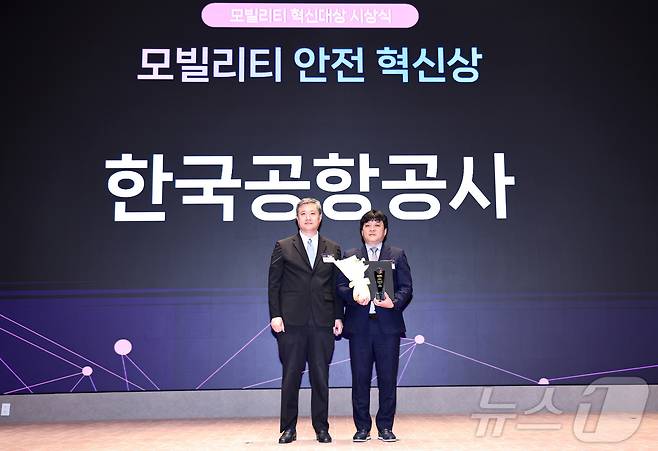 (서울=뉴스1) 구윤성 기자 = 윤태형 뉴스1 상무가 25일 오후 서울 영등포구 한국거래소 컨퍼런스홀에서 열린 '2024 대한민국 모빌리티 혁신대상&포럼'에서 모빌리티 안전 혁신상을 수상한 한국공항공사 관계자와 기념촬영을 하고 있다. 2024.6.25/뉴스1