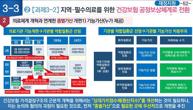 이를 위해 그간 의료기관을 중심으로 평가해왔는데 지역 내 성과를 평가하고 보상하는 네트워크를 만들어야 한다는 견해다. 또 상급종합병원은 중증 환자를 중심으로 진료할 수 있도록 시스템을 구축해야 한다고 했다. 의료기관을 기능별로 구분하고 기능에 맞는 진료를 하면 보상을 더 주고, 기능에 부적합한 진료를 하면 보상을 적게 하는 기능 중심 보상체계를 구축해야 한다고 제언했다. 예컨대 최중증, 희귀난치 질환은 '빅5' 같은 중증종합병원에서, 소아암 등 사망직결 질환은 광역 거점병원에서, 중증 진료는 권역거점병원과 상급종합병원에서 보고, 고난이도 진료는 종합병원, 특정질환 진료는 특화중증 전뭉병원에서 진료할 수 있도록 하는 것이다. 또 중증 진료는 보상을 강화하고 지역 병원에는 중증진료 대기 비용도 예산과 건강보험으로 보상해야 한다고 했다.