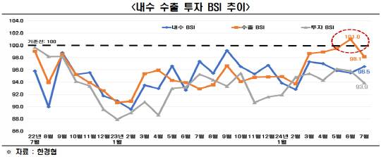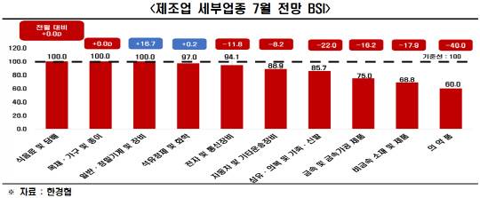 국내 제조업종의 현 상황에 그리 녹록치 못하다. 한국경제인협회가 이날 매출액 기준 600대 기업을 대상으로 기업경기실사지수(BSI)를 조사한 결과, 제조업 BSI 88.5는 기준선(100)을 밑돌아 올 1월 이후 최저 수준까지 떨어졌으며, 기준선을 넘은 제조업종은 하나도 없었다. 최근 의료사태를 겪은 의약품(60.0)이 가장 저조했다는 점에서 파업 등 현장이탈의 여파를 보여줬고 전자·통신장비(94.1), 자동차·기타운송장비(88.9)도 기준선을 밑이었다.