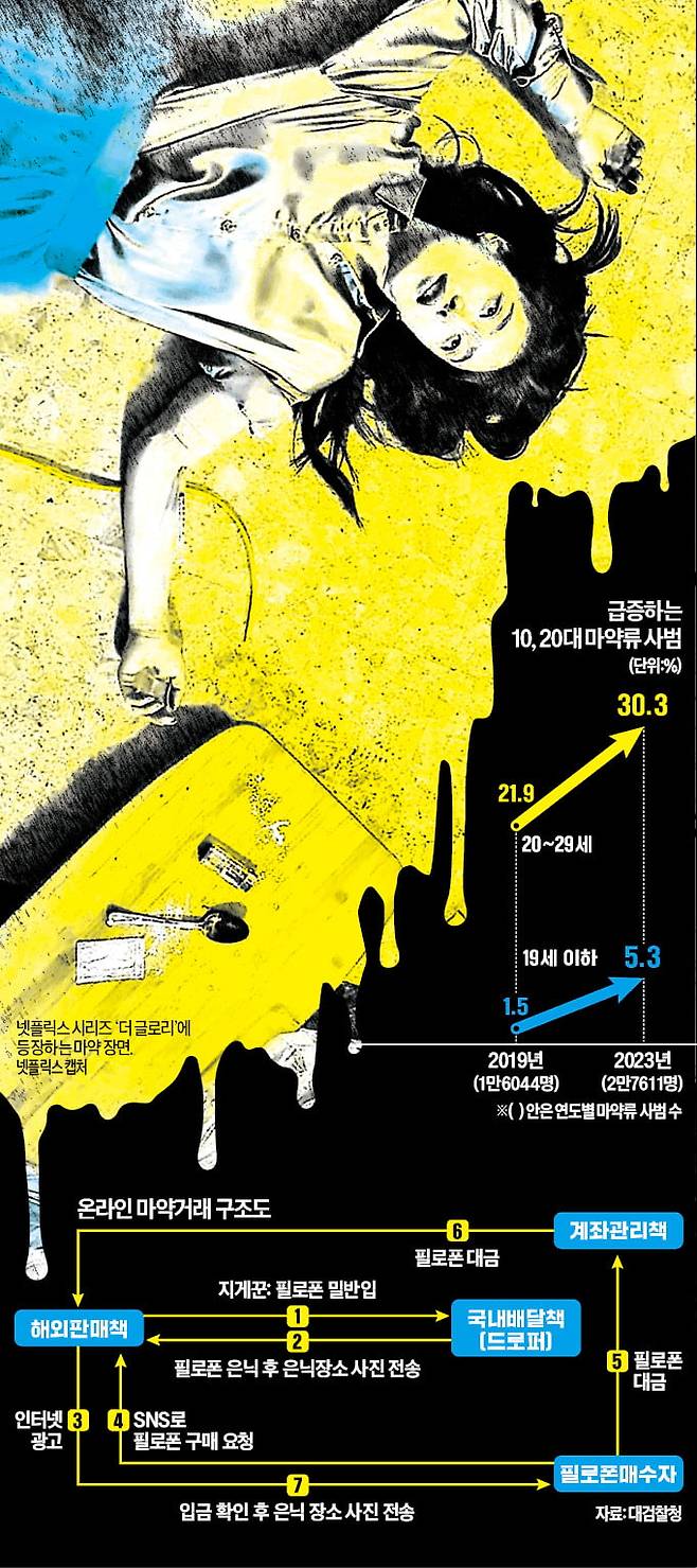 마약류관리법 위반을 처벌하는 수위가 점점 강해지지만 코인·도박 등으로 신용불량자로 내몰려 구직이 어려운 사회 초년생은 위험을 감수하고 마약시장에 뛰어든다. 이들이 삶을 던져 번 몇백만원은 마약류 총책에겐 푼돈이다. 검찰 등 수사기관에선 판매책이 밀수 1회당 10배, 많게는 20배까지 이윤을 남기는 것으로 파악하고 있다. 이태순 대검찰청 마약과장은 “마약류 밀수가 최소 5년형에 처해지는 중범죄라는 것을 알면서도 돈이 궁해 앞뒤 가리지 않고 뛰어드는 사회 초년생이 많다”며 “마약류 유통시장이 걷잡을 수 없이 커지고 있다”고 우려했다.