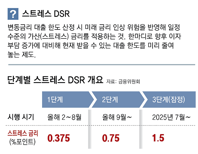 당초 금융위는 올 7월부터 기본 스트레스 금리의 50%(0.75%)를 적용하는 2단계 조치를, 내년 초부터 100%(1.5%)를 적용하는 3단계 조치를 시행하며 규제 강도를 단계적으로 높일 예정이었다. 그러나 이날 갑자기 2단계 조치를 7월에서 9월로, 3단계 조치는 내년 초에서 내년 하반기로 연기하겠다고 밝혔다.
