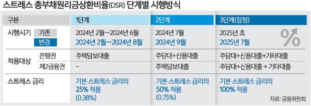 금융위원회는 25일 관계기관과 협의를 거쳐 2단계 스트레스 DSR 시행일을 9월1일로 2개월 연기한다고 발표했다. 다음달 발표 예정인 범정부적 자영업자 지원대책, 이달 말 시행되는 부동산 PF 사업성 평가 등을 고려해 결정했다는 게 금융위의 설명이다. 금융위 관계자는 “2단계 스트레스 DSR을 적용받는 모든 차주의 한도가 감소하는 게 아니라 ‘고DSR’ 차주의 최대한도가 감소하는 건데, 자금 수요가 긴박한 분들이 많다”며 “제2금융권 주담대가 줄어드는 차주가 15% 정도로 분석돼 이들의 어려움을 좀 고려했다”고 연기 배경을 밝혔다.