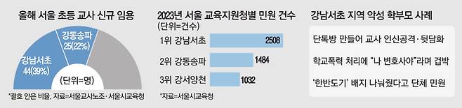 전국에서 학생이 몰리며 인기를 끄는 강남·서초지역 초등학교들이 정작 교사들 사이에선 기피지역으로 꼽히고 있다. 악성 민원을 넣는 극성 학부모들이 적지 않은 데다, 교사 1명 당 맡아야 하는 학생 수가 많기 때문이다. 견디다 못한 고참 교사들이 앞다퉈 전보 신청을 하는 바람에 갓 임용돼 발령 순위가 낮은 신참 교사들이 배치되고 있다.