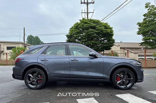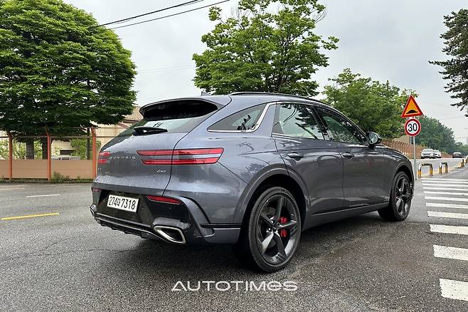 이 같은 요소들을 종합적으로 갖추고 난 GV70의 면모는 이전보다 더욱 역동적이다. 형님인 GV80보다 덩치는 작지만 어둑한 페인트는 과감한 잔근육을 더 잘 드러낸다. 보닛의 캐릭터 라인과 거대한 에어 인테이크 등은 눈길을 사로잡는다. 쿠페형 SUV를 연상케 하는 날렵한 루프라인과 풍만하게 솟아오른 펜더도 역동적인 인상을 더한다.