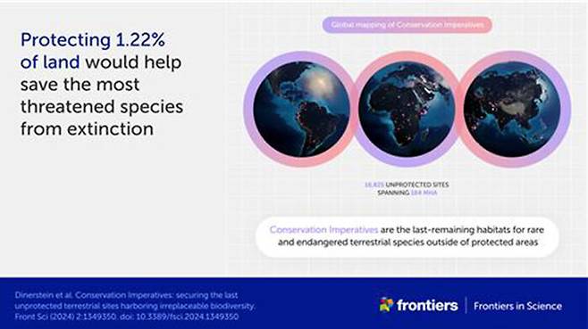 미국 비정부기구(NGO) 리졸브(Resolve) 에릭 디너스타인 박사가 이끄는 국제 연구팀은 26일 과학 저널 '프런티어스 인 사이언스'(Frontiers In Science)에서 희귀·멸종 위기 동물 서식지와 기존 보호구역 등을 분석, 세계 지표면의 1.2%를 보존 필수지역으로 설정하면 대멸종을 막을 수 있다는 결론을 얻었다며 이같이 밝혔습니다.
