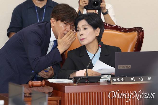 | ▲ 최민희 과학기술정보방송통신위원장이 25일 오후 서울 여의도 국회에서 열린 과학기술정보방송통신위원회 전체회의에서 관계자의 보고를 받고 있다. |