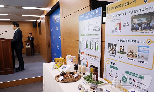 곽도연 국립식량과학원장이 26일 세종시 정부세종청사 농림축산식품부에서 우리 쌀 100%와 토종 유산균으로 만든 유산발효물이 대장염과 과민성 장 증후군 개선에 효과를 보인 연구 결과를 발표하고 있다.