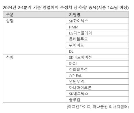 26일 금융정보업체 에프앤가이드에 따르면 올해 2·4분기 영업이익 추정치가 상향된 시가총액 상위주는 SK하이닉스, HMM, LG디스플레이, 넷마블, 위메이드, DL 등이다.