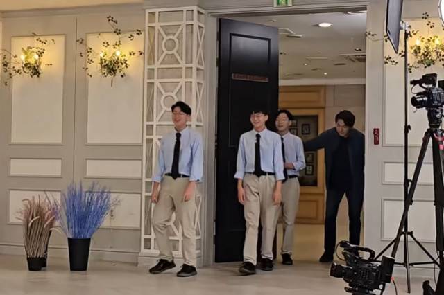 베이지색 바지와 푸른색 셔츠를 맞춰 입은 삼둥이는 아빠 송일국과 함께 등장해 제작진의 환호를 받았다.