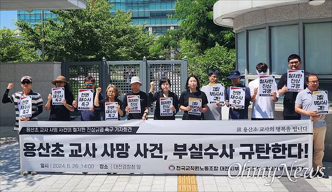 전교조 대전·충남·세종지부와 대전지역 단체 등은 26일 오후 대전경찰청 앞에서 기자회견을 열고 "대전 용산초 교사 순직 사건 부실 수사, 불송치 결정을 한 대전경찰청을 강력하게 규탄한다"라고 밝혔다.