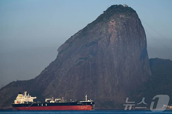 (리우데자네이루 AFP=뉴스1) 임여익기자 = 그리스 유조선 레온티스호가 지난 20일 슈거로프산(팡지아수카르)을 배경으로 브라질 리우데자네이루 구아나바라만을 항해하고 있다. 2024.06.26