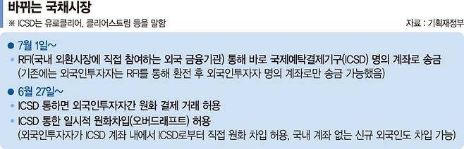 정부는 ICSD인 유로클리어·클리어스트림과 국채통합계좌 구축 추진, 외국 금융기관(RFI)의 한국시장 참여 허용, 외환시장 제도개선 등을 이번에 시행하면 9월 편입 가능성을 훨씬 높일 수 있다고 전망하고 있다.