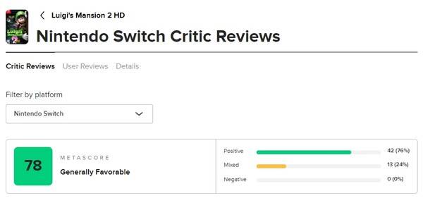 닌텐도 3DS 명작 '루이지 맨션: 다크 문'의 리마스터 버전 '루이지 맨션2 HD'가 메타크리틱 78점을 받았다. 원작이 받았던 85점보다 낮은 점수인데, 그래픽 리마스터 이외 다른 추가 요소가 없다는평가가 지배적이다.