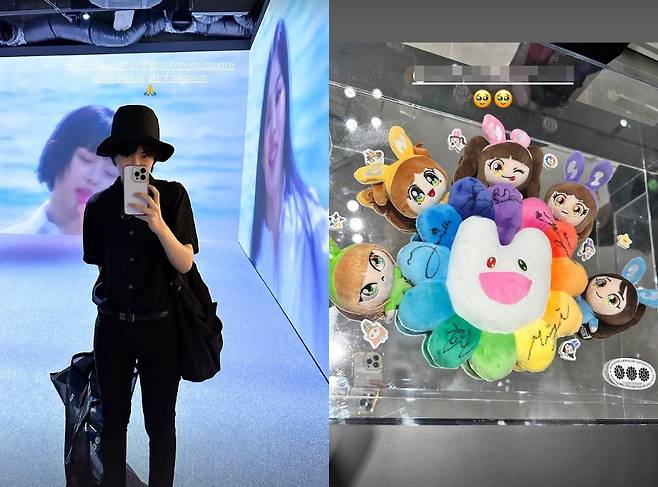 공개된 사진 속 심은경은 뉴진스 멤버들이 담겨있는 벽면을 뒤로하고 자신의 모습을 담아냈다. 올블랙 컬러의 의상에 모자를 걸친 심은경은 뉴진스를 배경으로 포즈를 취하고 있다.