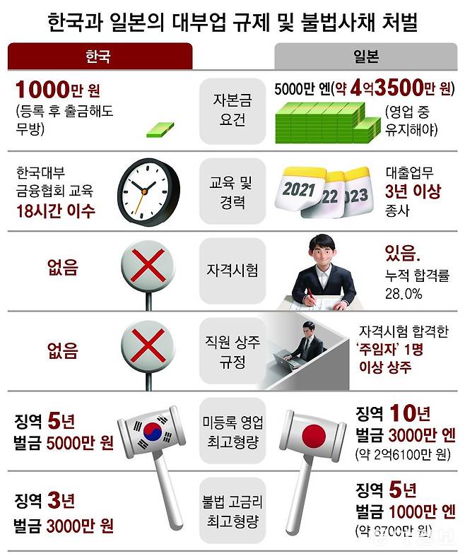 불법사채 피해자를 돕고 있는 송태경 민생연대 사무처장은 “믿을 수 없는 대부업체가 진입하지 못하도록 일본처럼 부채를 뺀 ‘순자산액’만 자본금으로 인정하고, 설립 기준액도 최소 3억 원으로 높여야 한다”고 말했다.